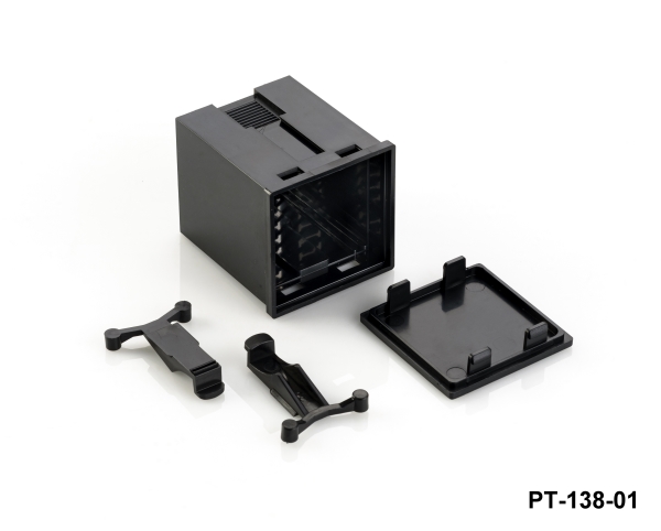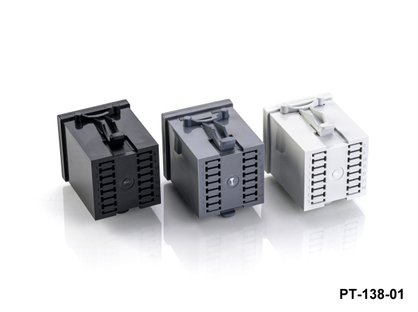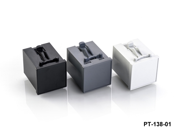 The PT-138-01 DIN Panel Enclosure is made from high-quality ABS plastic in a light gray or black color and measures 48 mm x 48 mm x 58.5 mm. It comes with a body, frame, panel and side clamps for easy mounting. Contact our International Sales team for more information on customization and quantity details.
