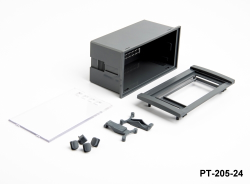 The PT-205-24 DIN Panel Enclosure is made from high-quality ABS plastic in a light gray or black color and measures 72 mm x 144 mm x 75.8 mm. It comes with a body, frame, panel and side clamps for easy mounting. Contact our International Sales team for more information on customization and quantity details.