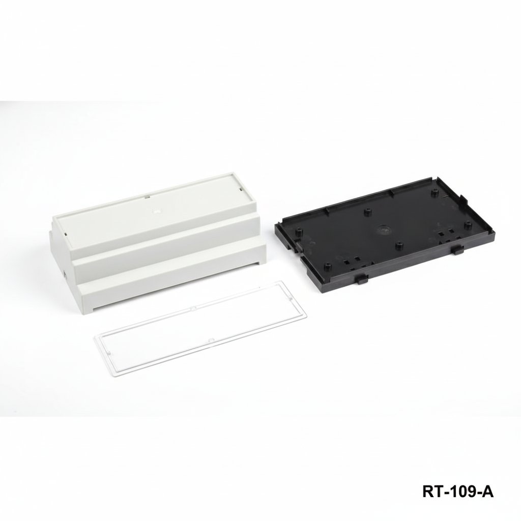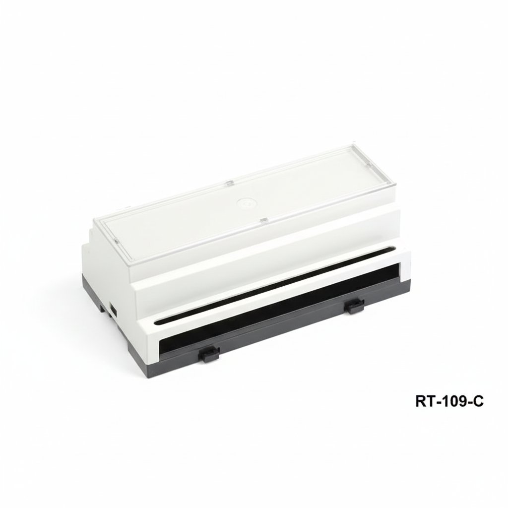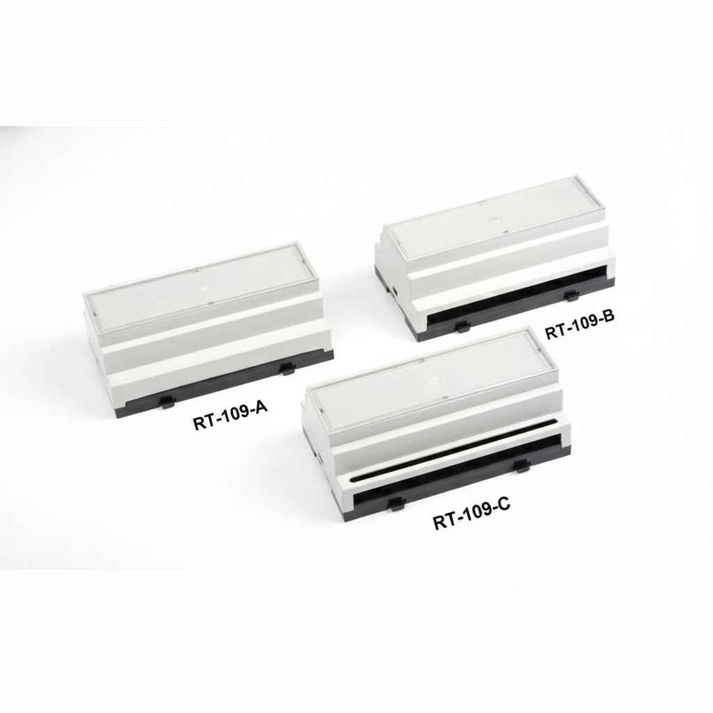 The RT-109 din rail box is designed for a wide range of applications including time relays, automation, IOT, test and measurement, smart homes and KNX. Made of UL94-V0 material for durability and long life, it is available in light gray. With dimensions of 159 mm x 87 mm x 60 mm, it offers ample space for various electronic components. The RT-109 also provides versatility for different installations with three different housing types (A, B and C).