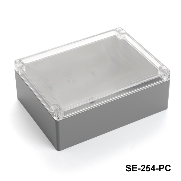 SE-254 is a heavy duty enclosure with IP67 certificate. Waterproof and dustproof features allow usage in outdoor applications. Customization by CNC machining, UV printing and laser marking is available for this product. The product is produced with ABS material. Clear lid with PC material is an available option.