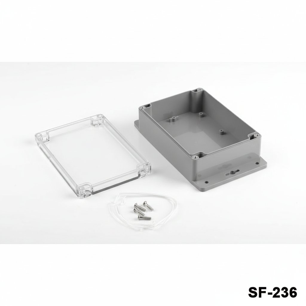 SF-236 is a flanged heavy duty enclosure with IP67 certificate. Waterproof and dustproof features allow usage in outdoor applications. Flanges with screw holes provide you an easy assembly to the wall. Customization by CNC machining, UV printing and laser marking is available for this product. The product is produced with ABS material. Clear lid with PC material is an available option.