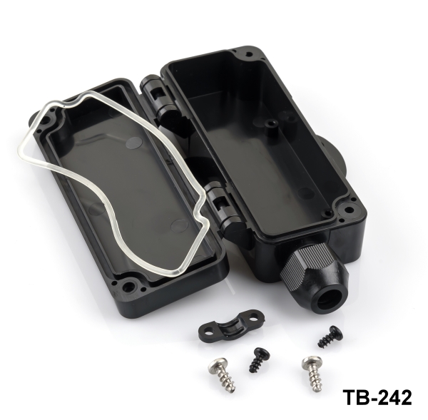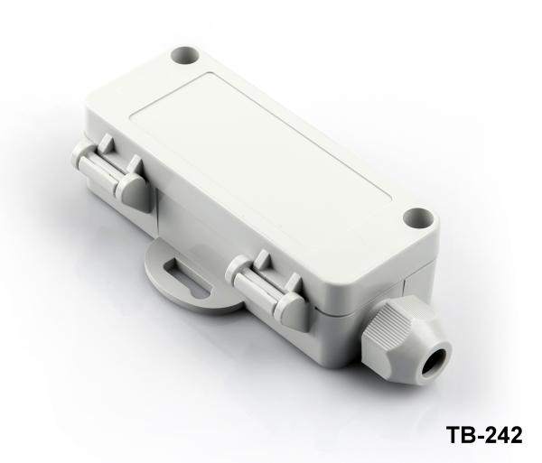 8698651420265TB-242 is an IP67 enclosure with cable glands, can be mountable on the wall thanks to its mounting ear. The enclosure has hinges on to keep the lid together with the base. The product is manufactured by ABS V0 material, for the non-flammability degree. Continuous seal is included for providing IP67. Cable glands are molded on and supports IP67 feature.