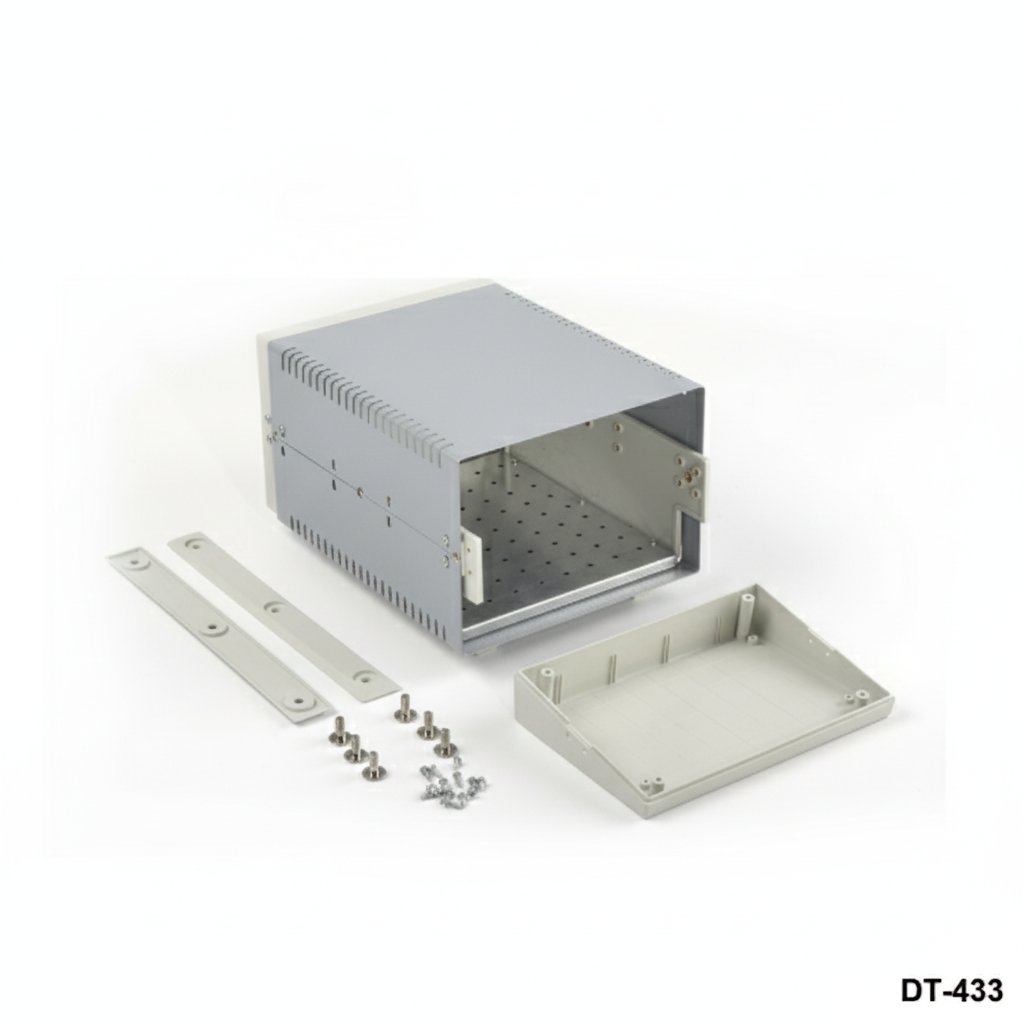 Наклоненият корпус за уреди DT-433 е трайно и удароустойчиво решение за приложения за уреди и контрол, изработено от комбинация от материали ABS-UL94-HB и ламарина, с наклонен дизайн за лесен преглед и достъп до електронните компоненти.