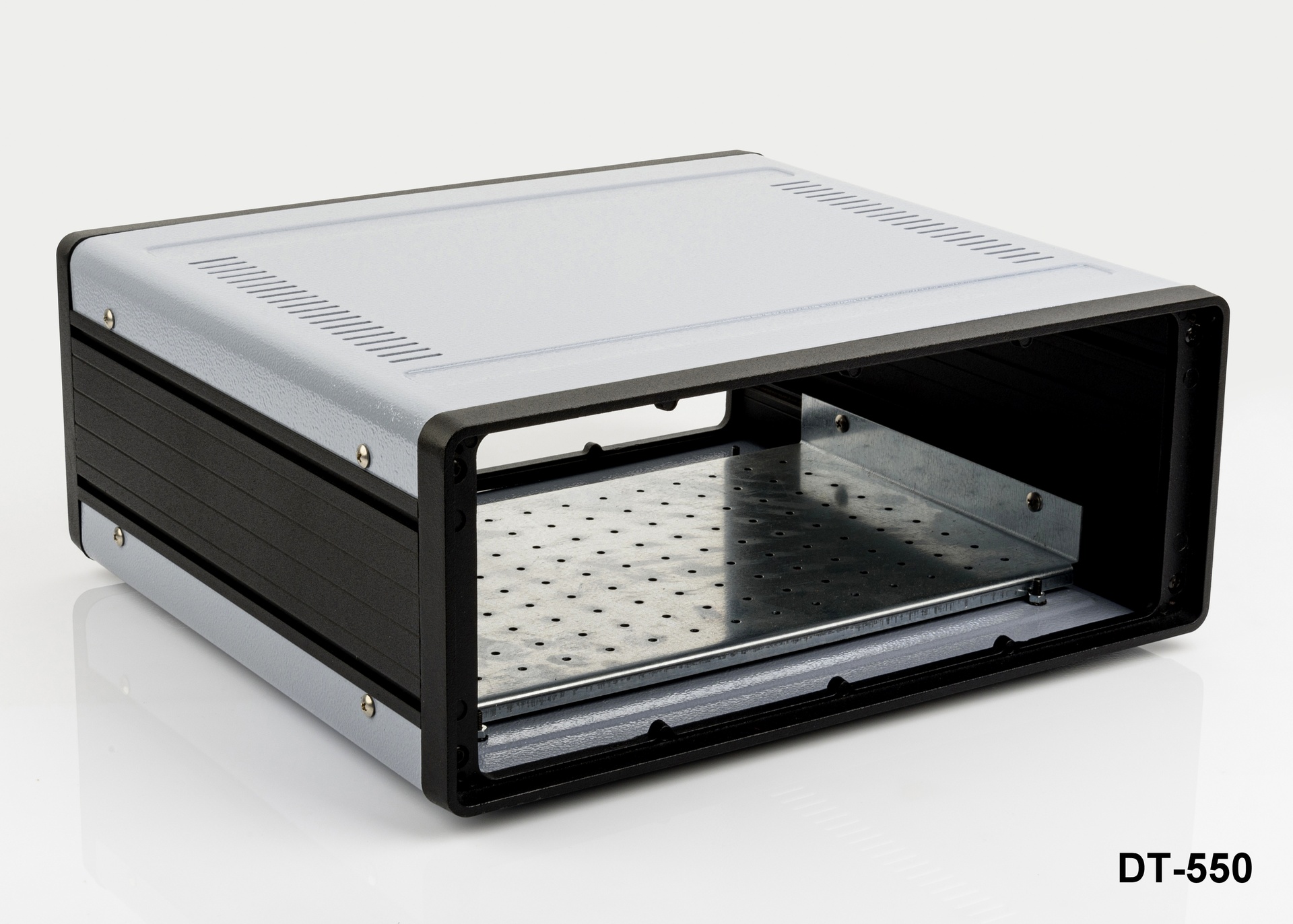 Алуминиевият корпус за настолни компютри DT-550 е здраво и издръжливо решение за различни настолни приложения, изработено от висококачествена алуминиева ламарина с отлични екраниращи свойства и добра топлопроводимост.