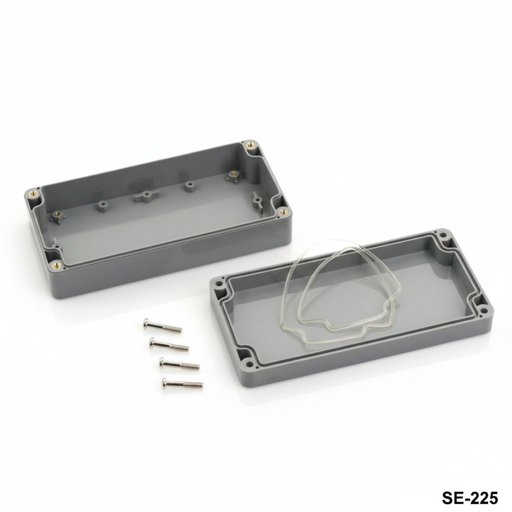 SE-225 е корпус за тежки условия на работа със сертификат IP67. Водоустойчивите и прахоустойчивите характеристики позволяват използването му в приложения на открито. За този продукт се предлага персонализиране чрез CNC обработка, UV печат и лазерно маркиране. Продуктът е произведен от ABS материал. Прозрачният капак с материал от PC е налична опция.