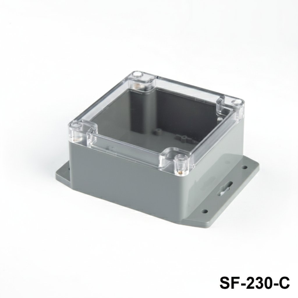 SF-230 е фланцов корпус за тежки условия на работа със сертификат IP67. Водонепроницаемостта и прахоустойчивостта позволяват използването му в приложения на открито. Фланците с отвори за винтове ви осигуряват лесен монтаж към стената. За този продукт се предлага персонализиране чрез CNC обработка, UV печат и лазерно маркиране. Продуктът е произведен от ABS материал. Прозрачният капак с материал от PC е налична опция.