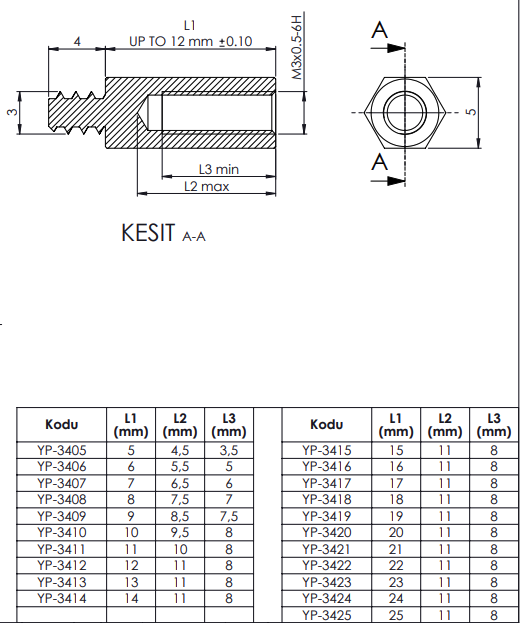 YP-3400 Месингов шестостен - M3 (PT за пластмаси) - дължина на резбата 4 мм