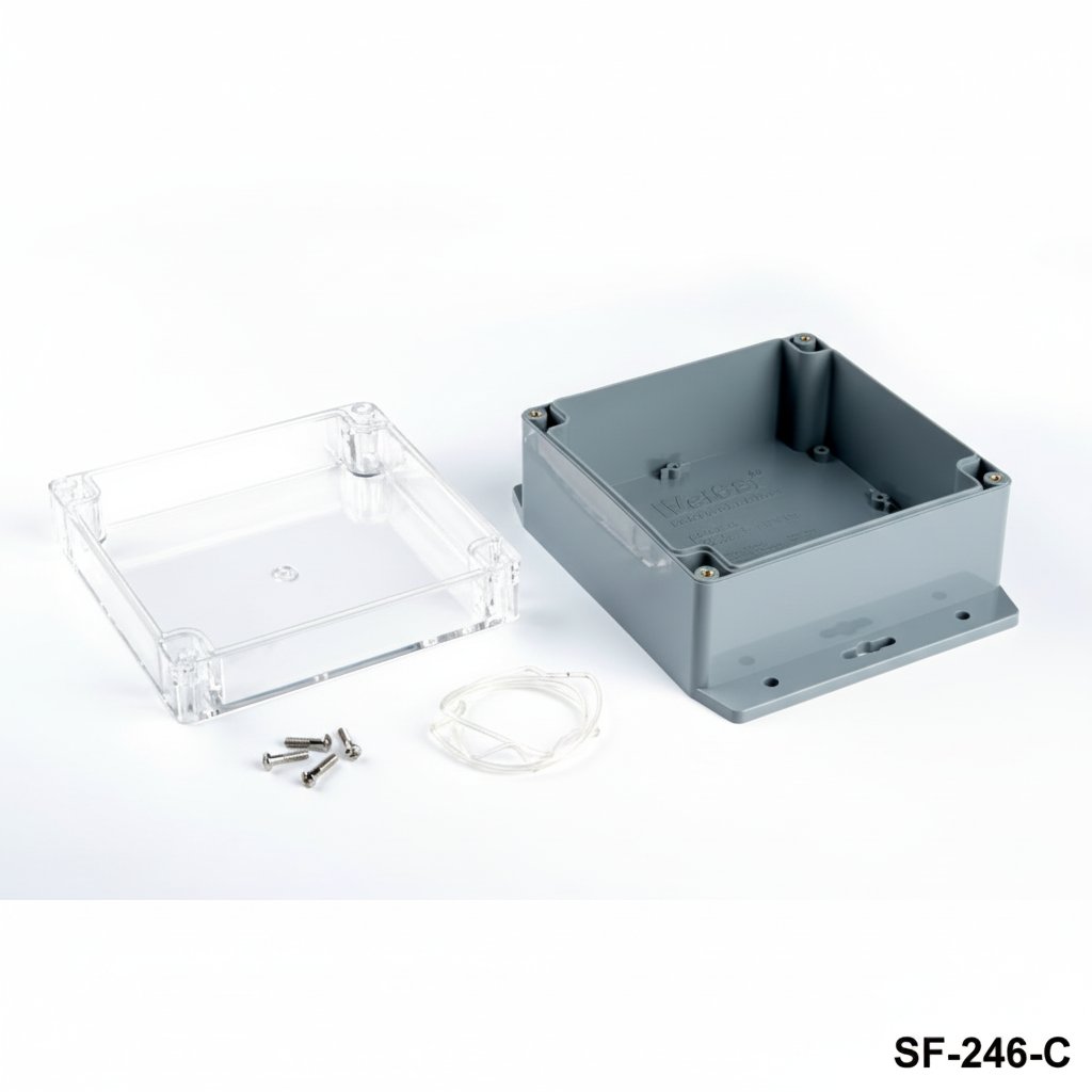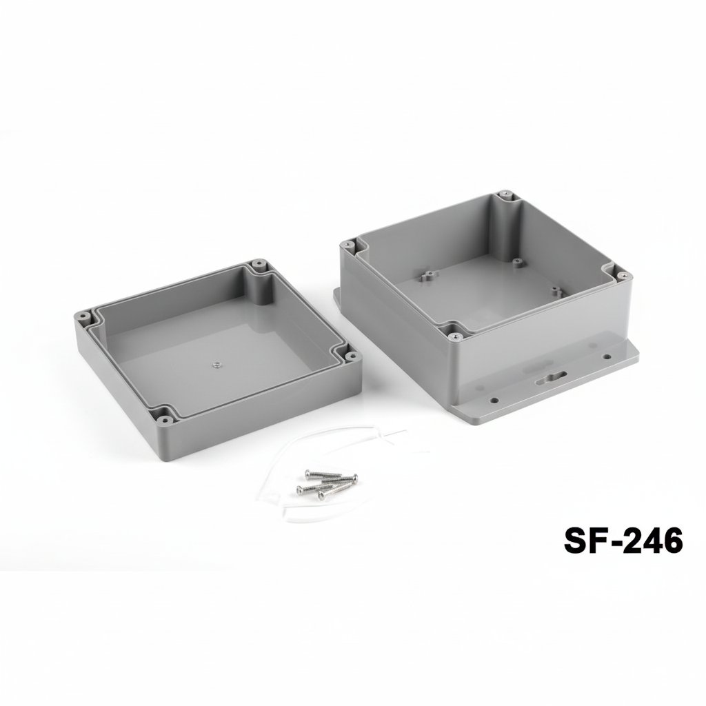 Το SF-246 είναι ένα φλαντζωτό περίβλημα βαρέως τύπου με πιστοποιητικό IP67. Τα αδιάβροχα και ανθεκτικά στη σκόνη χαρακτηριστικά επιτρέπουν τη χρήση σε εξωτερικές εφαρμογές. Οι φλάντζες με οπές για βίδες σας παρέχουν εύκολη συναρμολόγηση στον τοίχο. Για αυτό το προϊόν διατίθεται προσαρμογή με μηχανική κατεργασία CNC, εκτύπωση UV και σήμανση με λέιζερ. Το προϊόν παράγεται από υλικό ABS. Το διαφανές καπάκι με υλικό PC είναι μια διαθέσιμη επιλογή.
