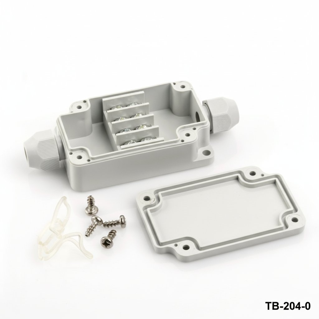 Το TB-204 είναι ένα περίβλημα IP67 με στυπιοθλίπτες καλωδίων, μπορεί να τοποθετηθεί στον τοίχο χάρη στα αυτιά τοποθέτησης. Το προϊόν κατασκευάζεται από υλικό ABS V0, για τον βαθμό μη αναφλεξιμότητας. Περιλαμβάνεται συνεχής στεγανοποίηση για την παροχή IP67. Οι στυπιοθλίπτες καλωδίων είναι χυτοί και υποστηρίζουν τη λειτουργία IP67.