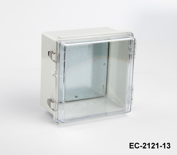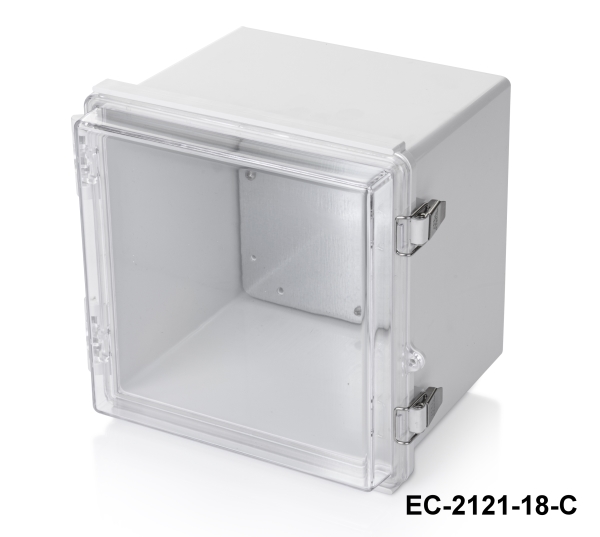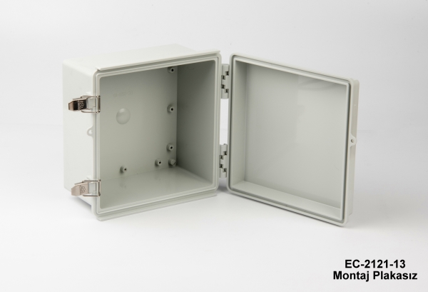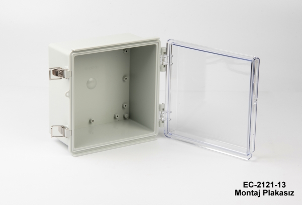 La EC-2121 es una caja de plástico con bisagras con certificado IP67. Está disponible en dos tamaños diferentes: 210 x 210 x 100 y 210 x 210 x 130. Estos armarios pueden utilizarse en exteriores para diversas aplicaciones eléctricas. La junta de TPE garantiza su resistencia al agua y al polvo. El material de stock para este producto es ABS a prueba de golpes. El ASA es otra opción recomendada para aplicaciones de alta resistencia. Otra oferta opcional es una tapa transparente con material PC (policarbonato). La placa de montaje de acero galvanizado de 1 mm facilita el montaje de sus componentes dentro de la caja. Las cajas están bien protegidas con los cierres de acero inoxidable. Otros accesorios opcionales relacionados son los kits de montaje en pared de aluminio y plástico, el kit de montaje en poste y el juego de puerta interior. El mecanizado CNC y las personalizaciones con impresión UV están disponibles como para todos los productos Altinkaya.