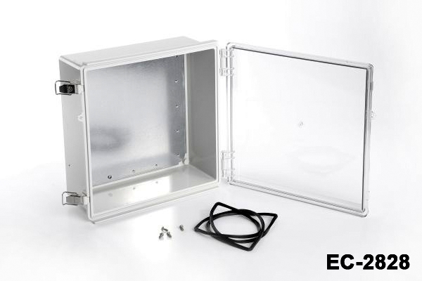 El EC-2828 es un armario de plástico con bisagras con certificado IP67. Estos armarios pueden utilizarse en exteriores para diversas aplicaciones eléctricas. La junta de TPE garantiza la resistencia al agua y al polvo. El material en stock para este producto es ABS a prueba de golpes. El ASA es otra opción recomendada para aplicaciones de alta resistencia. Otra oferta opcional es una tapa transparente con material PC (policarbonato). La placa de montaje de acero galvanizado de 1 mm facilita el montaje de sus componentes dentro de la caja. Las cajas están bien protegidas con los cierres de acero inoxidable. Otros accesorios opcionales relacionados son los kits de montaje en pared de aluminio y plástico, el kit de montaje en poste y el juego de puerta interior. El mecanizado CNC y las personalizaciones con impresión UV están disponibles como para todos los productos Altinkaya.