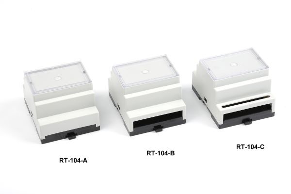 La caja para carril DIN RT-104 es una solución de alta calidad y personalizable fabricada con material UL94-V0 y disponible en color gris claro, con 3 tipos de cuerpo diferentes y una base para montaje en carril, diseñada para proteger dispositivos eléctricos y electrónicos en una gran variedad de aplicaciones, como relés temporizados, automatización, IoT, pruebas y mediciones, hogar inteligente y KNX.