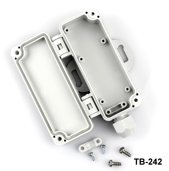 8698651420265Le TB-242 est un boîtier IP67 avec presse-étoupes, qui peut être fixé au mur grâce à son Anneaux de fixation. Le boîtier est équipé de charnières pour maintenir le couvercle solidaire de la base. Le produit est fabriqué en ABS V0, pour son degré d'ininflammabilité. Un joint continu est inclus pour assurer l'indice de protection IP67. Les presses-étoupes sont moulées et supportent la caractéristique IP67.