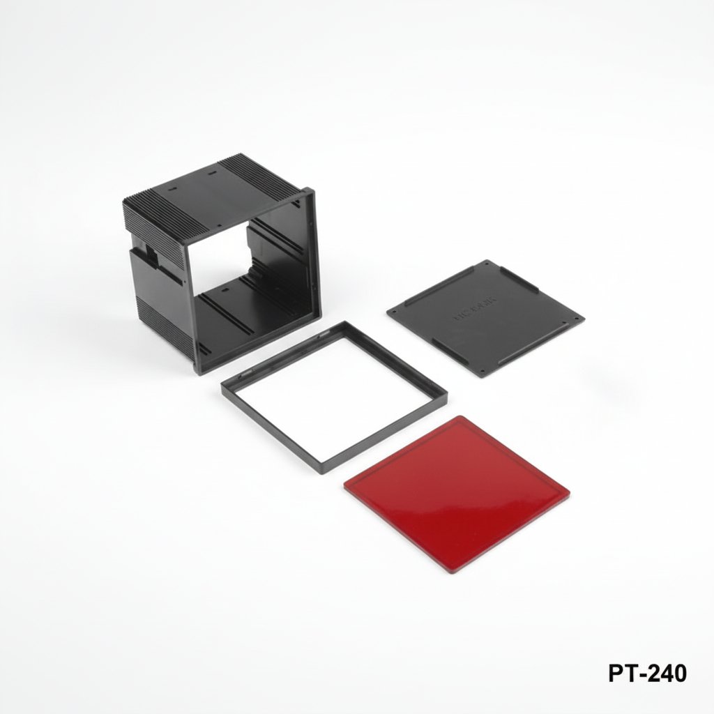 PT-230 DINパネルエンクロージャは、ライトグレーまたはブラックの高品質ABSプラスチック製で、サイズは96 mm x 96 mm x 75 mmです。本体、フレーム、パネル、サイドクランプが付属しており、簡単に取り付けることができます。カスタマイズや数量の詳細については、国際営業チームにお問い合わせください。