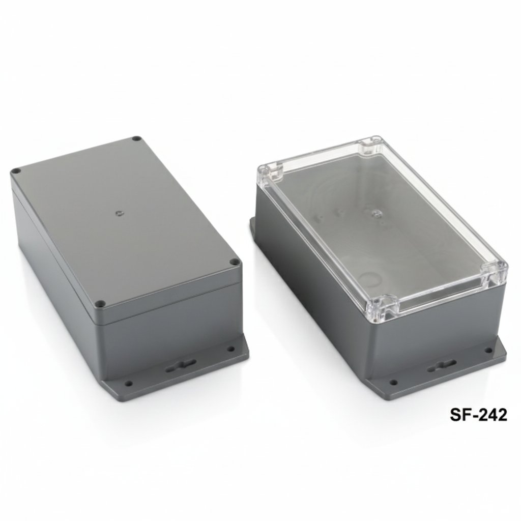 フランジは、表面への取り付けを容易にします。組み込みシステム、トランスミッター、気圧計、ガスセンサー、湿度センサー、温度制御、高水準の保護が必要な測定アプリケーションに最適です。屋外用途では、日光に耐性のあるASA素材での生産も可能です。