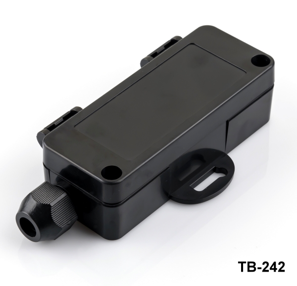 TB-242は、ケーブルグランド付きのIP67エンクロージャで、取り付け耳のおかげで壁に取り付けることができます。筐体にはヒンジが付いており、蓋をベースと一緒に保つことができます。不燃性のABS V0材料で製造されています。IP67を提供するために連続シールが含まれています。ケーブルグランドはモールドされており、IP67に対応しています。