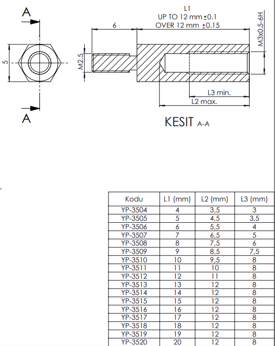 YP-3500 真鍮六角スタンドオフ - オスM2.5×メスM3