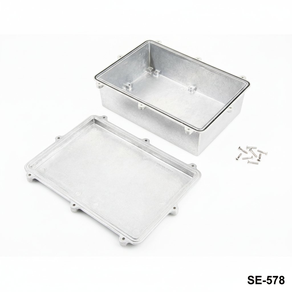 De natuurlijke aluminium afwerking van deze behuizing kan, afhankelijk van de hoeveelheid, in elke gewenste kleur worden gepoedercoat. Neem contact op met ons Internationale verkoopteam voor informatie over details over aantallen en aanpassingsopties. De SE-578 heeft dubbele kanalen voor afdichtingen, waarbij de ene zorgt voor waterdichtheid en de andere een EMI-afdichting is. De EMI-afdichting moet apart besteld worden.