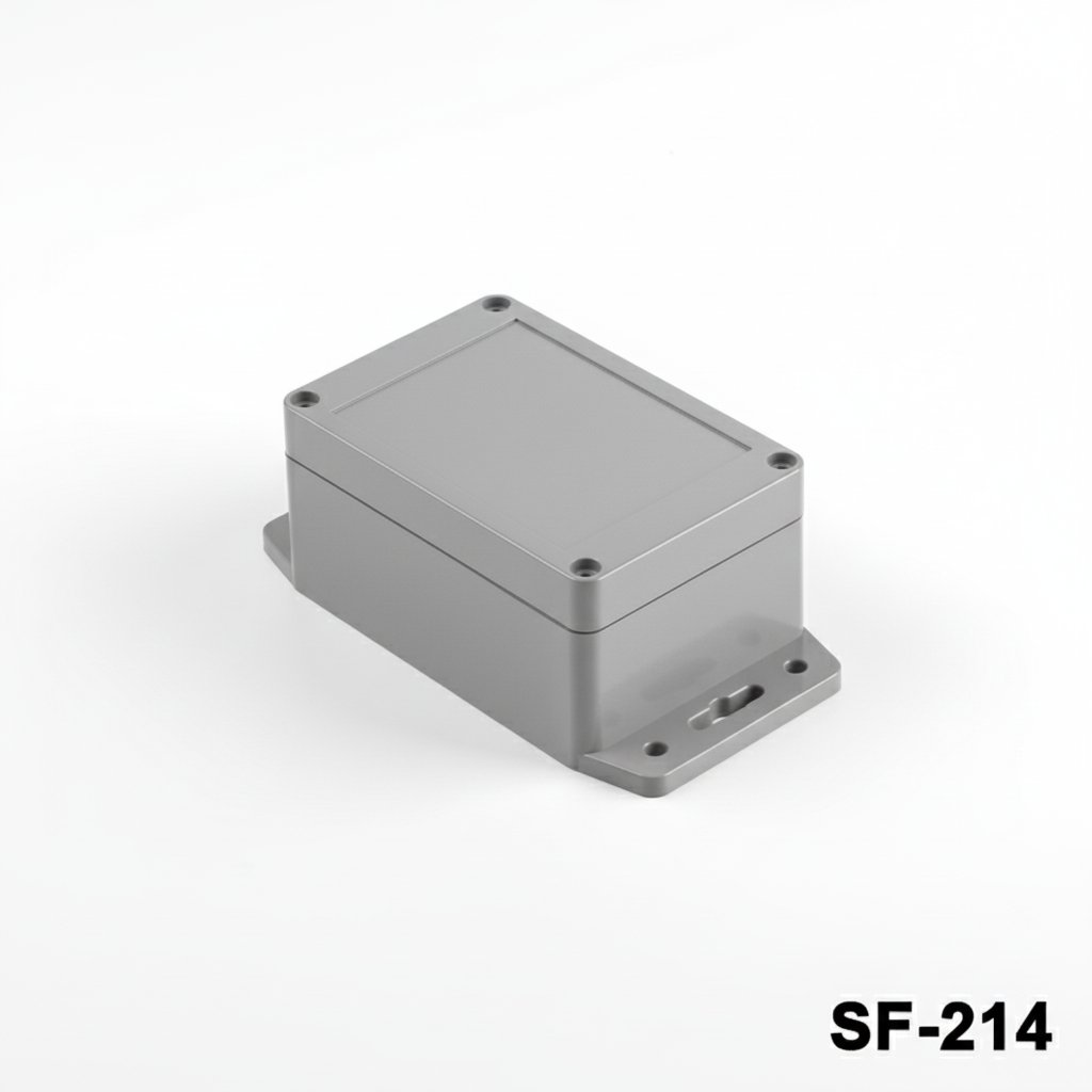 SF-214 is een geflensde behuizing voor zwaar gebruik met IP67-certificaat. Water- en stofdichte eigenschappen maken gebruik in buitentoepassingen mogelijk. Flenzen met schroefgaten zorgen voor eenvoudige montage aan de muur. Dit product kan worden aangepast door CNC-bewerking, UV-bedrukking en lasermarkering. Het product is gemaakt van ABS-materiaal. Een doorzichtig deksel van PC-materiaal is als optie verkrijgbaar.