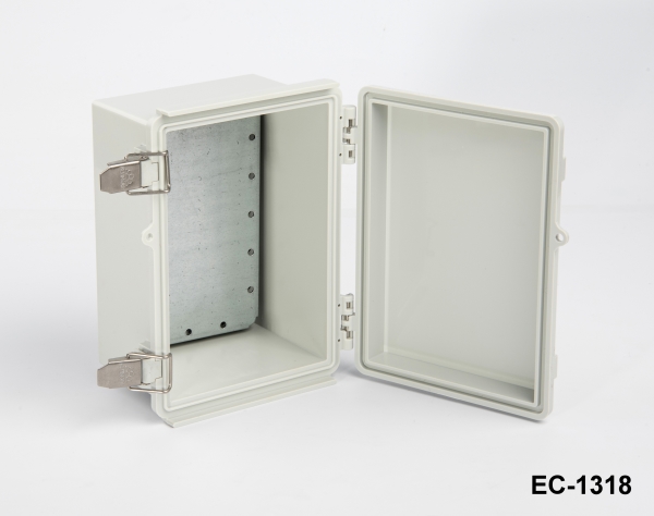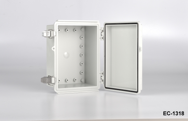 8698651327748EC-1318 to plastikowa obudowa na zawiasach z certyfikatem IP67. Obudowy te mogą być używane na zewnątrz do wielu zastosowań elektrycznych. Uszczelka TPE zapewnia odporność na wodę i kurz. Materiałem wyjściowym dla tego produktu jest odporny na wstrząsy ABS. ASA to kolejna zalecana opcja do ciężkich zastosowań. Inną opcjonalną opcją jest przezroczysta pokrywa z materiału PC (poliwęglan). Płyta montażowa z galwanizowanej stali o grubości 1 mm zapewnia łatwy montaż Państwa komponentów wewnątrz obudowy. Obudowy są dobrze zabezpieczone zatrzaskami ze stali nierdzewnej. Inne opcjonalne powiązane akcesoria to aluminiowe i plastikowe zestawy do montażu na ścianie, zestaw do montażu na słupie, zestaw drzwi wewnętrznych. Obróbka CNC i nadruki UV są dostępne tak jak w przypadku wszystkich produktów Altinkaya.