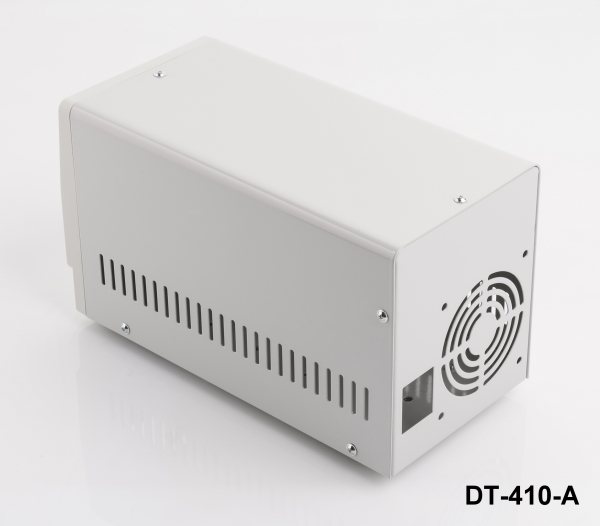 Medindo 126 mm x 258 mm x 145 mm, o DT-410 é compacto mas robusto. A cor cinzenta clara proporciona um aspeto elegante e profissional. A combinação de materiais utilizados assegura que é resistente ao impacto e ao calor, tornando-o adequado para utilização numa variedade de ambientes. A chapa metálica também proporciona propriedades de proteção adicionais para componentes electrónicos sensíveis.