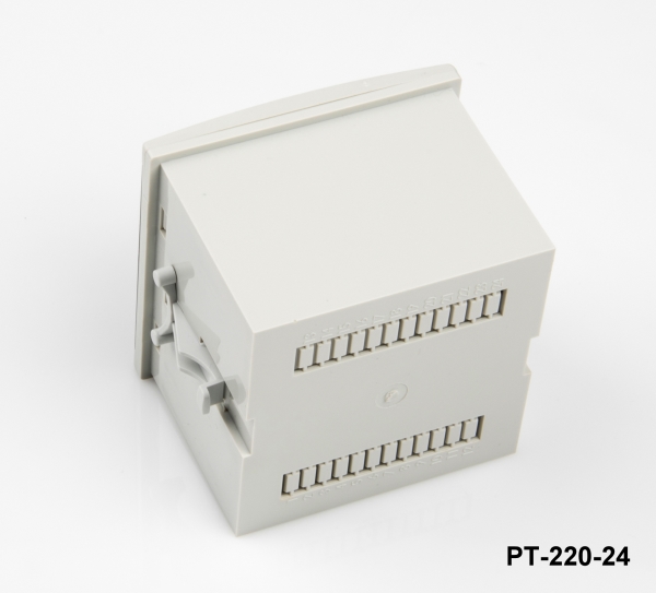 A caixa para painel DIN PT-220-24 é fabricada em plástico ABS de alta qualidade em cinzento claro ou preto e mede 96 mm x 96 mm x 76 mm. É fornecido com um corpo, uma estrutura, um painel e grampos laterais para facilitar a montagem. Contacte a nossa equipa de vendas internacionais para obter mais informações sobre personalização e detalhes de quantidade.
