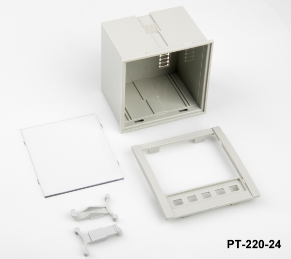 A caixa para painel DIN PT-220-24 é fabricada em plástico ABS de alta qualidade em cinzento claro ou preto e mede 96 mm x 96 mm x 76 mm. É fornecido com um corpo, uma estrutura, um painel e grampos laterais para facilitar a montagem. Contacte a nossa equipa de vendas internacionais para obter mais informações sobre personalização e detalhes de quantidade.