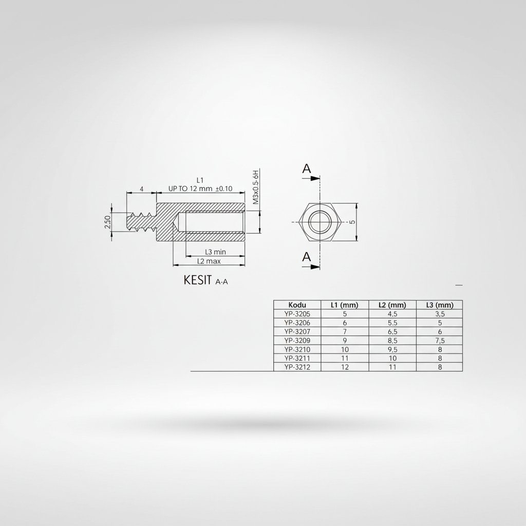 YP-3200 Suporte hexagonal de latão - Macho M2,5 (PT para plásticos) × Fêmea M3 - 4 mm de comprimento da rosca