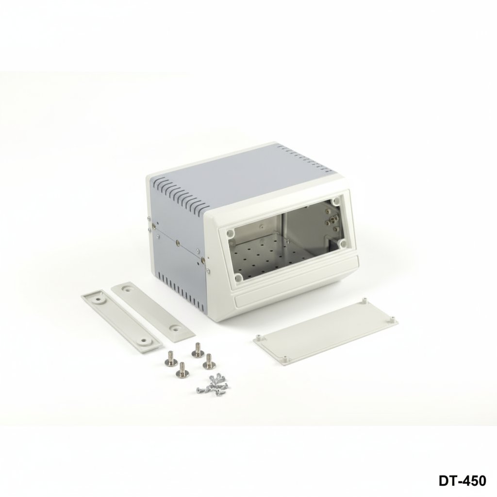Наклонный приборный корпус DT-450 - это прочное и ударостойкое решение для приборов и систем управления, изготовленное из комбинации материалов ABS-UL94-HB и листового металла, с наклонной конструкцией для удобного обзора и доступа к электронным компонентам.