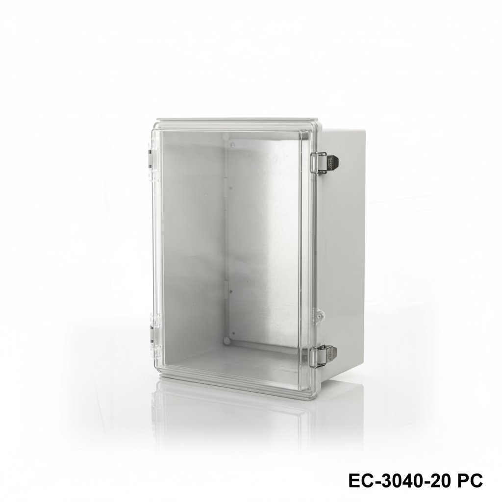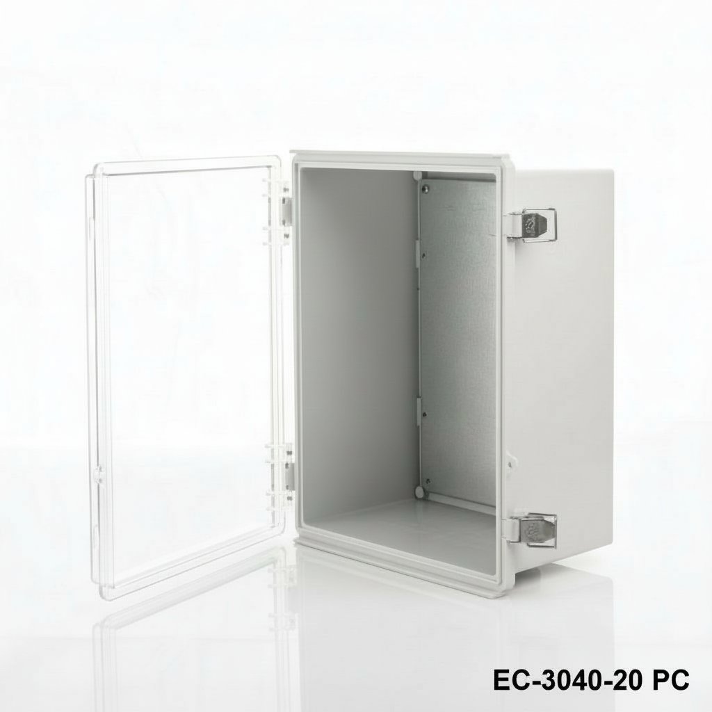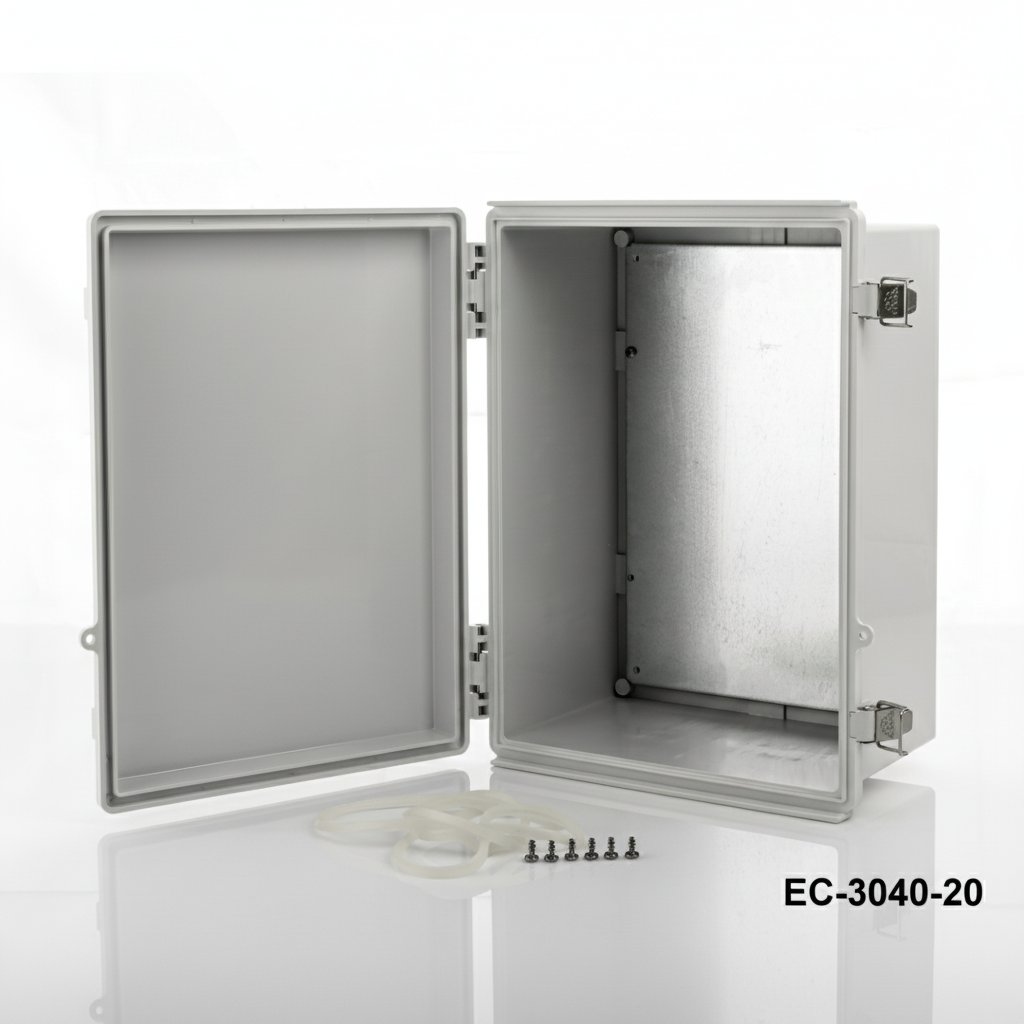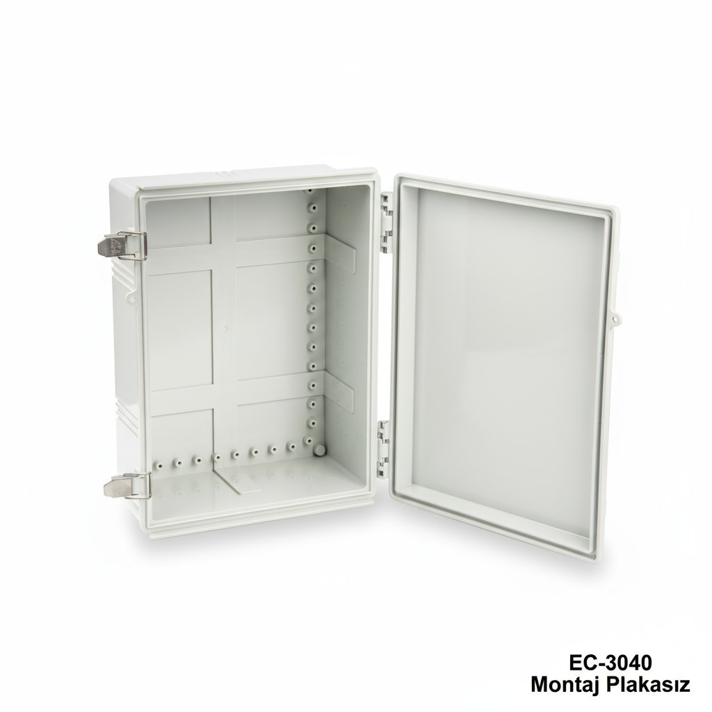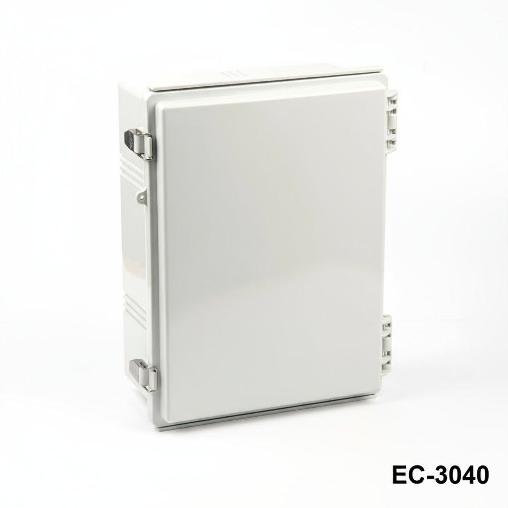 8698651356755EC-3040 is a hinged plastic enclosure with IP67 certificate. Available with 2 different sizes as 300 x 400 x 159 and 300 x 400 x 200. These cabinets can be used outdoor for several electrical applications. TPE gasket ensures resistancy against water and dust. Stock material for this product is shockproof ABS. ASA is another recommended option for heavy duty applications. Another optional offer is a clear lid with PC (Polycarbonate) material. 1 mm galvanized steel mounting plate provides easy mounting of your components inside the enclosure. The cases are well protected with the stainless steel latches. Other optional related accessories are aluminum and plastic wall mounting kits, pole mounting kit, inner door set. CNC machining and UV printing customizations are available as for all Altinkaya products.