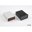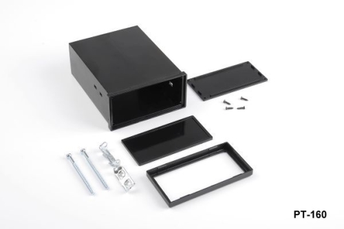 The PT-160 DIN panel enclosure is constructed from high-quality ABS plastic and measures 48 mm x 96 mm x 110 mm. Available in light gray or black, it features a body, panel, and side clamps for easy mounting. For customization options or quantity details, please contact our International Sales team.