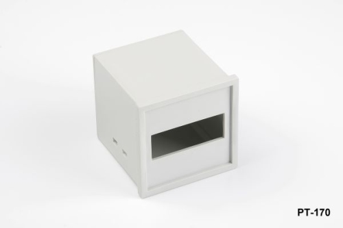 The PT-170 DIN panel enclosure is constructed from high-quality ABS plastic and measures 72 mm x 72 mm x 70 mm. Available in light gray or black, it features a body, panel, and side clamps for easy mounting. For customization options or quantity details, please contact our International Sales team.