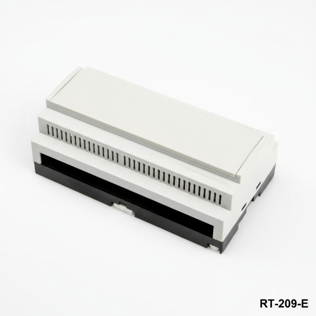 8698651435177The RT-209 Din Rail Enclosure is designed to protect electric and electronic devices. Made of high-quality UL94-V0 material, this enclosure provides durability and resistance to fire. With dimensions of 157.4mm x 91mm x 58.4mm, it is compatible with nine modules and offers 5 different body options for the terminal outputs. The enclosure is available in light gray or black color, and it can also be customized with transparent or smokey panel color options and panel design.