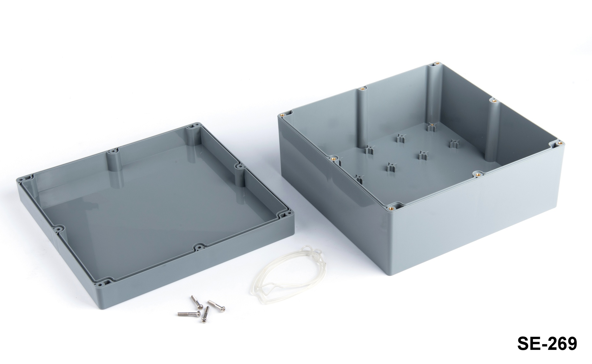 8698651372991SE-269 is a heavy duty enclosure with IP67 certificate. Waterproof and dustproof features allow usage in outdoor applications. Customization by CNC machining, UV printing and laser marking is available for this product. The product is produced with ABS material. Clear lid with PC material is an available option.