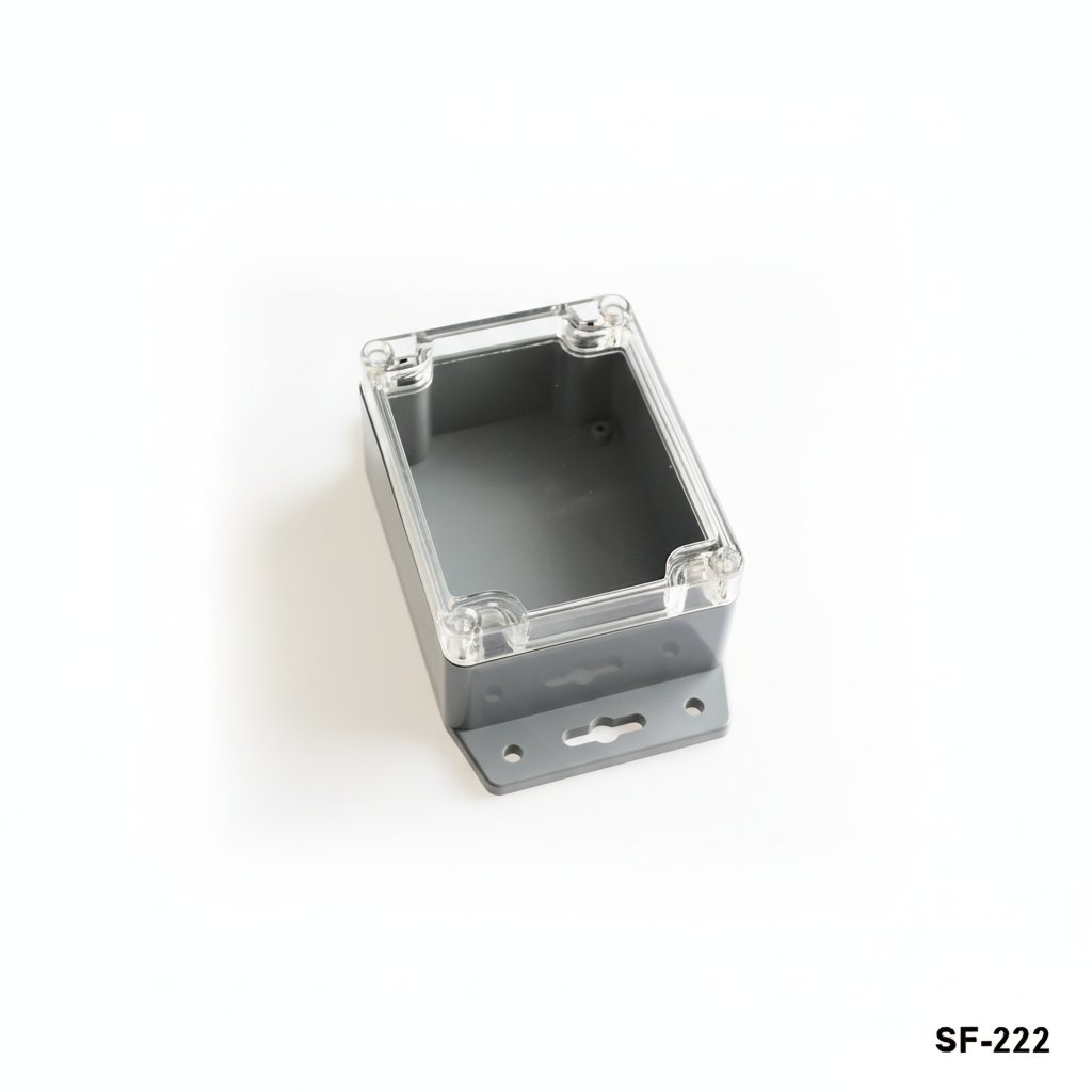 SF-222 is a flanged heavy duty enclosure with IP67 certificate. Waterproof and dustproof features allow usage in outdoor applications. Flanges with screw holes provide you an easy assembly to the wall. Customization by CNC machining, UV printing and laser marking is available for this product. The product is produced with ABS material. Clear lid with PC material is an available option.