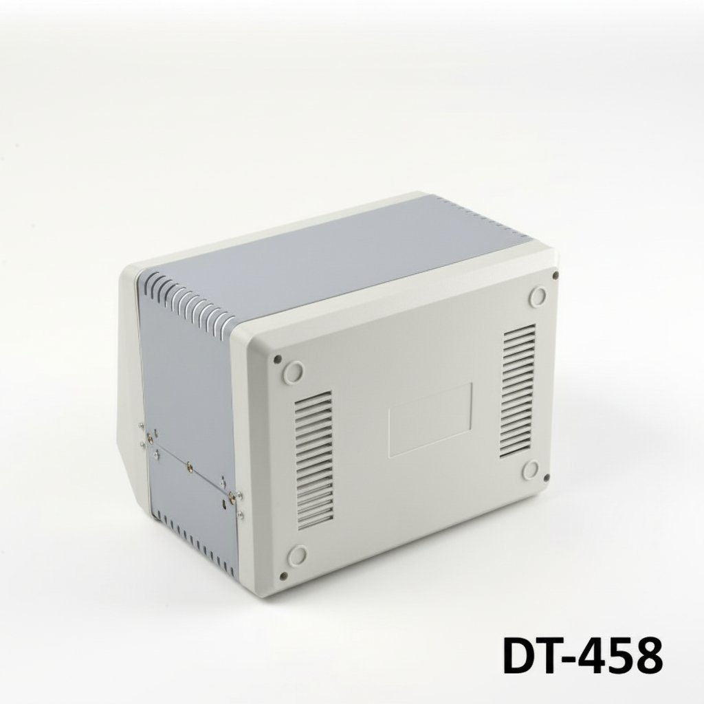 DT-458 Eğimli Alet Muhafazası, elektronik bileşenlere kolay görüntüleme ve erişim için eğimli bir tasarıma sahip, ABS-UL94-HB ve metal levha malzemelerin birleşiminden yapılmış, alet ve kontrol uygulamaları için dayanıklı ve darbeye dayanıklı bir çözümdür.