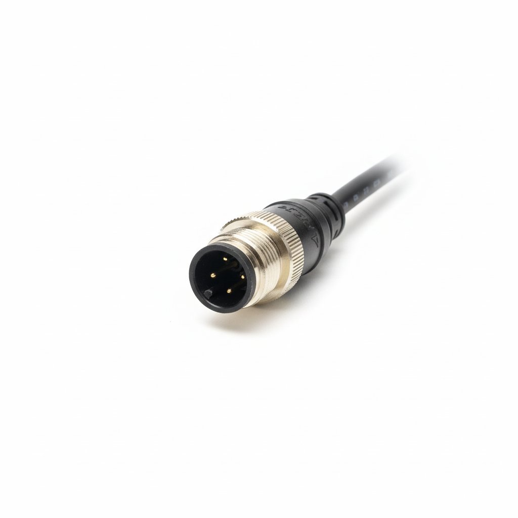 M12 kablolu 4 pin fiş tipi erkek konnektör. Alüminyum alaşım pin uzunluğu 3 mm'dir. IP-67 sınıfı su geçirmezlik.