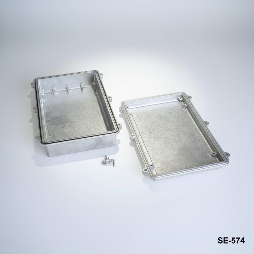 SE-574 IP67 Alüminyum Kutu, çeşitli elektronik ve elektrik uygulamalarında kullanılmak üzere tasarlanmış yüksek kaliteli, döküm alüminyum kutudur. 274 mm x 173 mm x 66 mm boyutlarıyla bu kutu, basınç vericileri, sismograflar, gömülü sistemler ve amplifikatörlerle kullanıma çok uygundur. SE-574,  biri su geçirmezlik, diğeri ise EMI conta için çift kanala sahiptir. EMI contanın ayrıca sipariş edilmesi gerekmektedir.