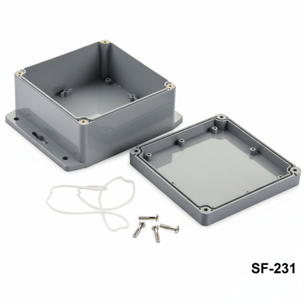 SF-231, IP67 sertifikasına sahip montaj ayaklı contalı bir kutudur. Su geçirmez ve toz geçirmez özellikleri ile dış mekan uygulamalarına uygundur. Vida delikli montaj ayakları duvara kolay montaj yapmanızı sağlar.  Ürün ABS malzemeden üretilmiştir. Flanşlar yüzeylere montajı kolaylaştırır. Yüksek seviyede koruma gerektiren gömülü sistemler, transmiterler, barometreler, gaz ve nem sensörleri, sıcaklık kontrolü ve ölçüm uygulamaları için ideal bir seçimdir. Dış mekan uygulamaları için güneşe maruz kalmaya dayanıklı ASA malzeme ile üretim de mümkündür.
