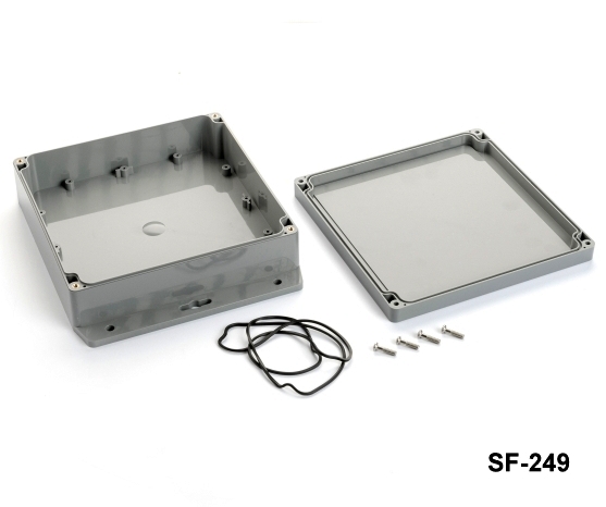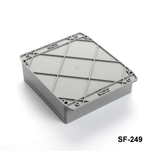 SF-249, IP67 sertifikasına sahip montaj ayaklı contalı bir kutudur. Su geçirmez ve toz geçirmez özellikleri ile dış mekan uygulamalarına uygundur. Vida delikli montaj ayakları duvara kolay montaj yapmanızı sağlar.  Ürün ABS malzemeden üretilmiştir.  Flanşlar yüzeylere montajı kolaylaştırır. Yüksek seviyede koruma gerektiren gömülü sistemler, vericiler, barometreler, gaz ve nem sensörleri, sıcaklık kontrolü ve ölçüm uygulamaları için ideal bir seçimdir. Dış mekan uygulamaları için güneşe maruz kalmaya dayanıklı ASA malzeme ile üretim de mümkündür.