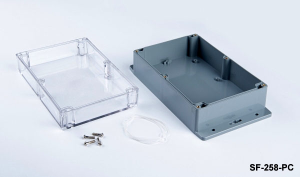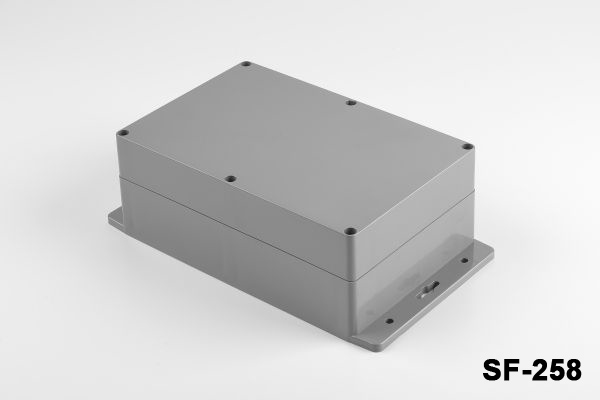 SF-258, IP67 sertifikasına sahip montaj ayaklı contalı bir kutudur. Su geçirmez ve toz geçirmez özellikleri ile dış mekan uygulamalarına uygundur. Vida delikli montaj ayakları duvara kolay montaj yapmanızı sağlar.  Ürün ABS malzemeden üretilmiştir. PC malzemeli şeffaf kapak opsiyoneldir. Flanşlar yüzeylere montajı kolaylaştırır. Yüksek seviyede koruma gerektiren gömülü sistemler, vericiler, barometreler, gaz ve nem sensörleri, sıcaklık kontrolü ve ölçüm uygulamaları için ideal bir seçimdir. Dış mekan uygulamaları için güneşe maruz kalmaya dayanıklı ASA malzeme ile üretim de mümkündür.