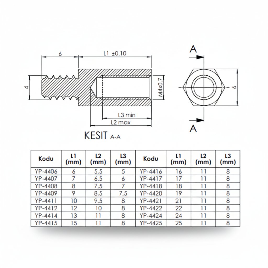 YP-3400 黄铜六角支座 - M3(塑料 PT) - 4 mm 螺纹长度